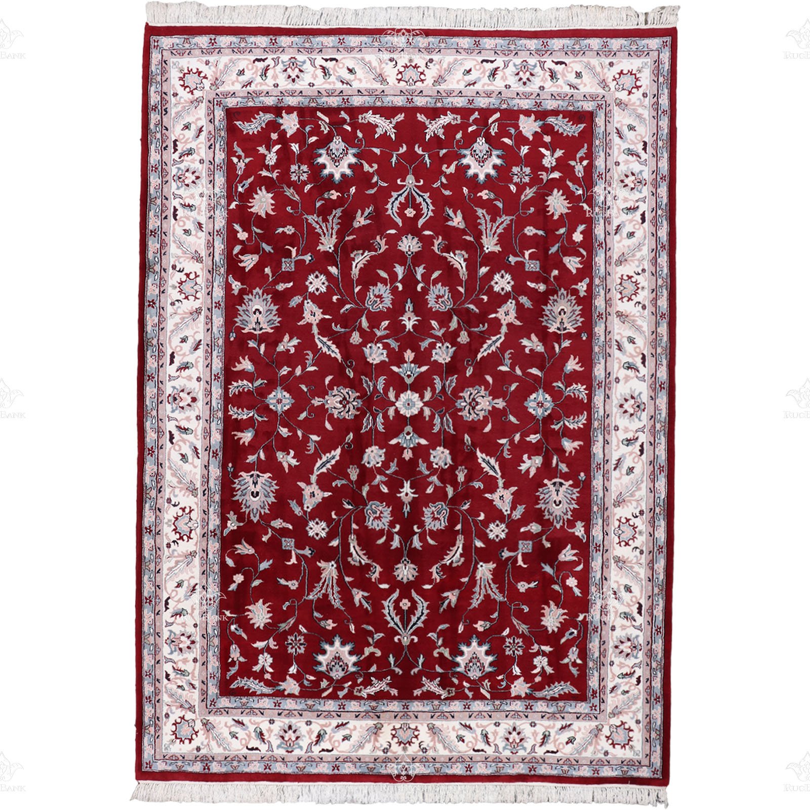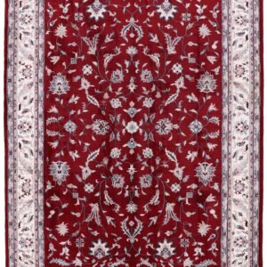 Are you searching for the perfect statement piece to elevate your home decor? Look no further than the exquisite Indian handmade rug with a mesmerizing Persian design. Picture this: a vivid burgundy color in the middle, surrounded by a crisp white background on the borders, adorned with intricate Persian motifs scattered all over. The result? A stunning contrast that will instantly transform any room into a luxurious oasis.