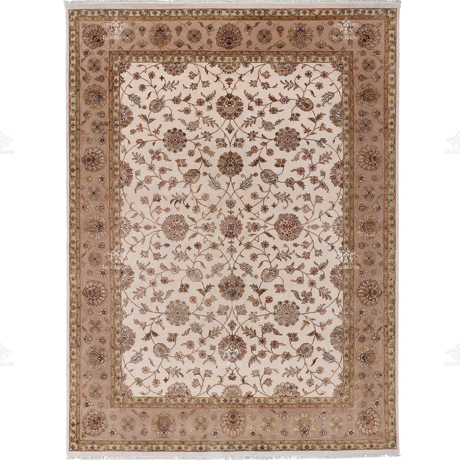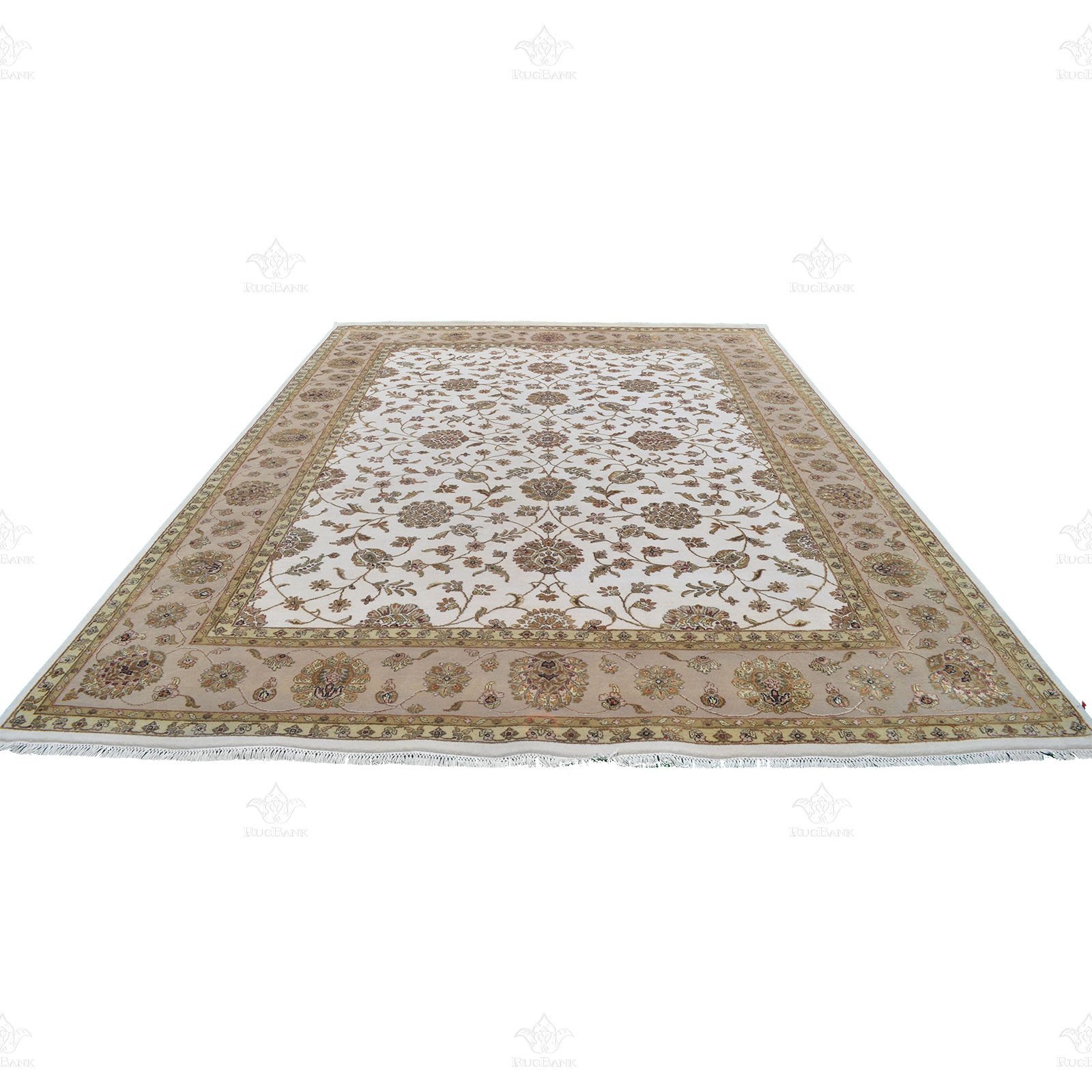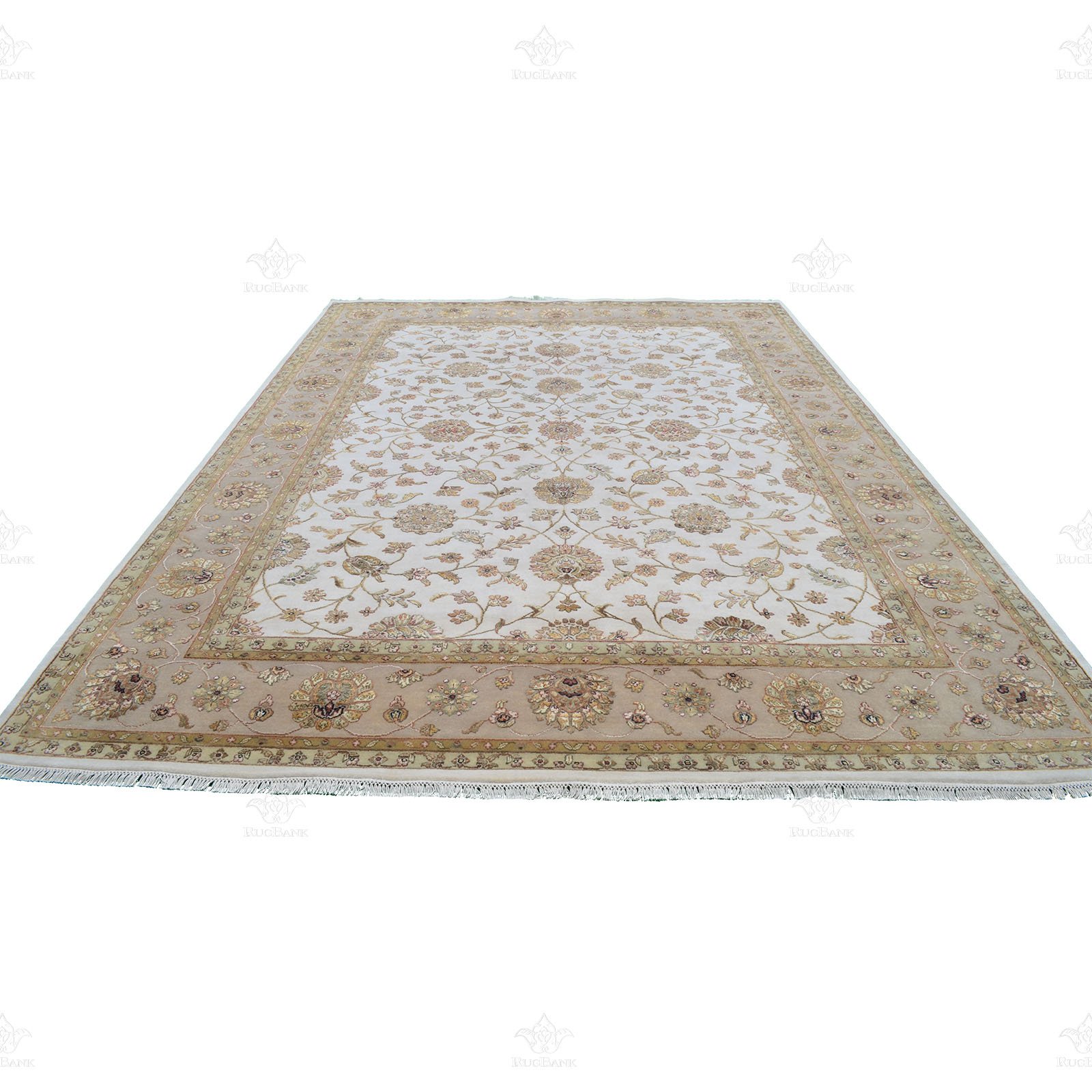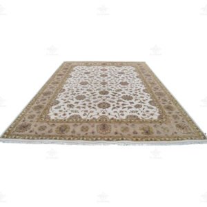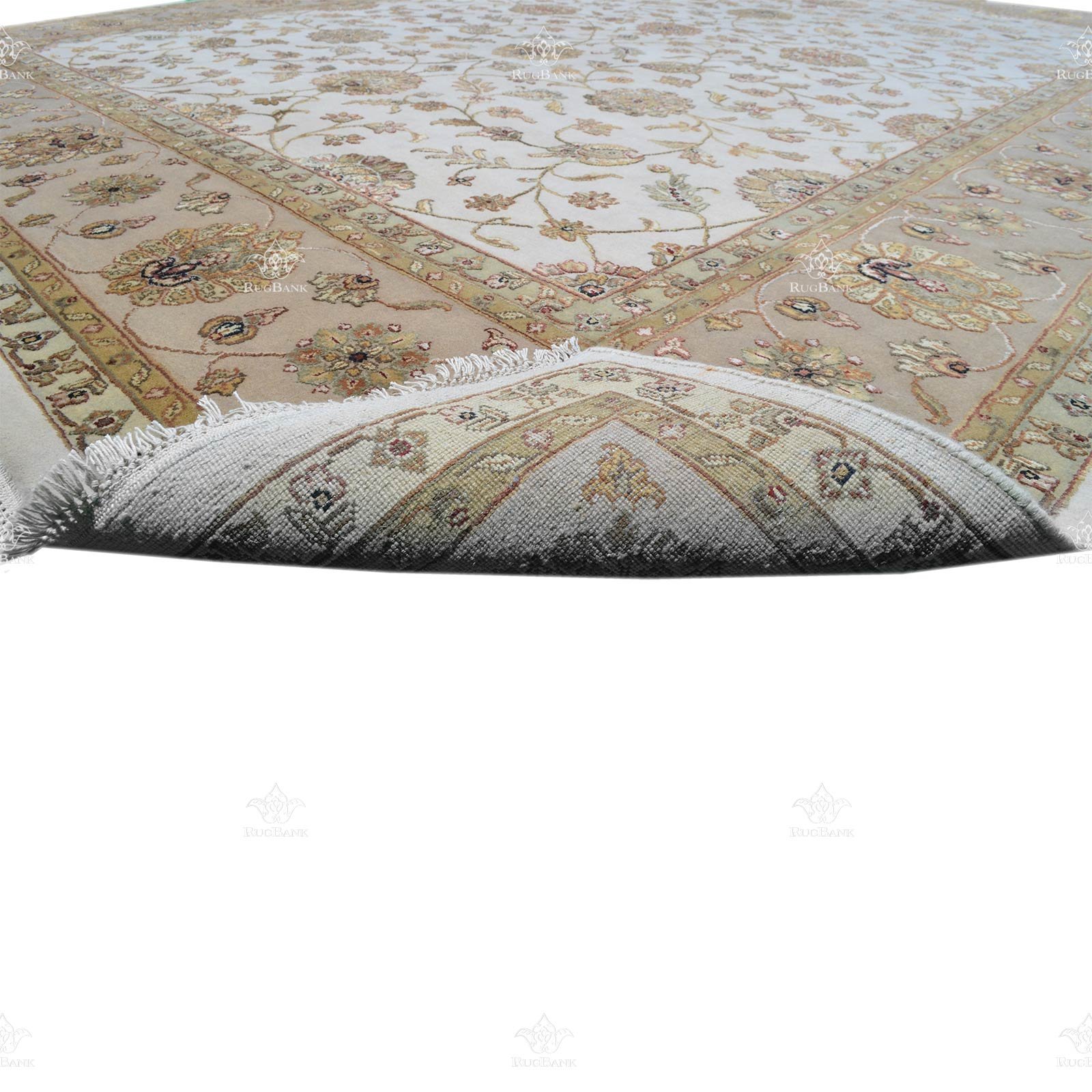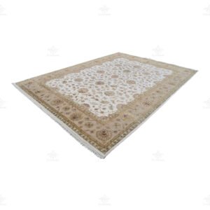 The traditional Indian floral design of this rug is truly a work of art. With a white background in the middle and an ivory background on the border, the intricate golden motifs scattered all over the rug add a touch of opulence and elegance. The combination of these colors and patterns creates a timeless and classic look that is perfect for both traditional and modern interiors.