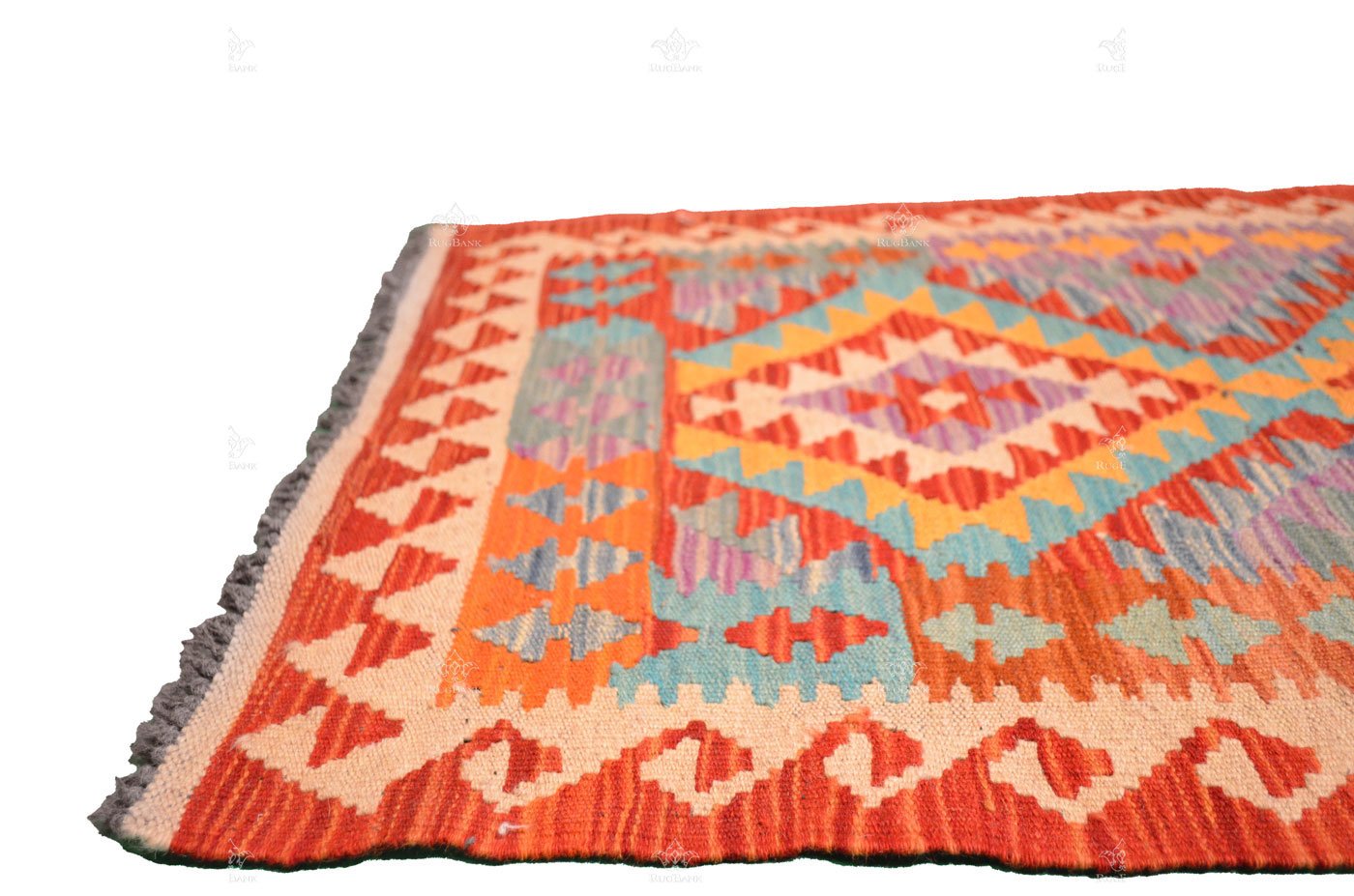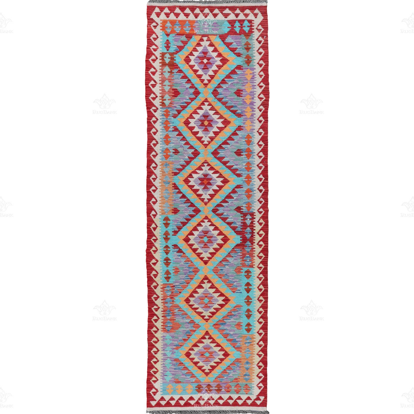 Our Handmade Runner Kilim is a work of art that beautifully marries tradition and modernity, all while introducing a captivating twist with the use of cyan. This rug exudes the charm of tradition and boasts a unique geometric design that sets it apart.