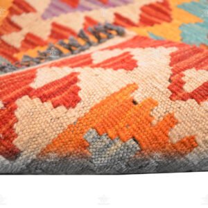 With this Handmade Runner Kilim, you’re not just adding a rug to your space; you’re bringing in a piece of art that challenges conventions and celebrates the beauty of the unexpected. This rug is a harmonious blend of tradition, modernity, and a dash of vibrant cyan.