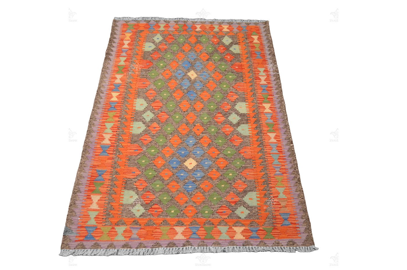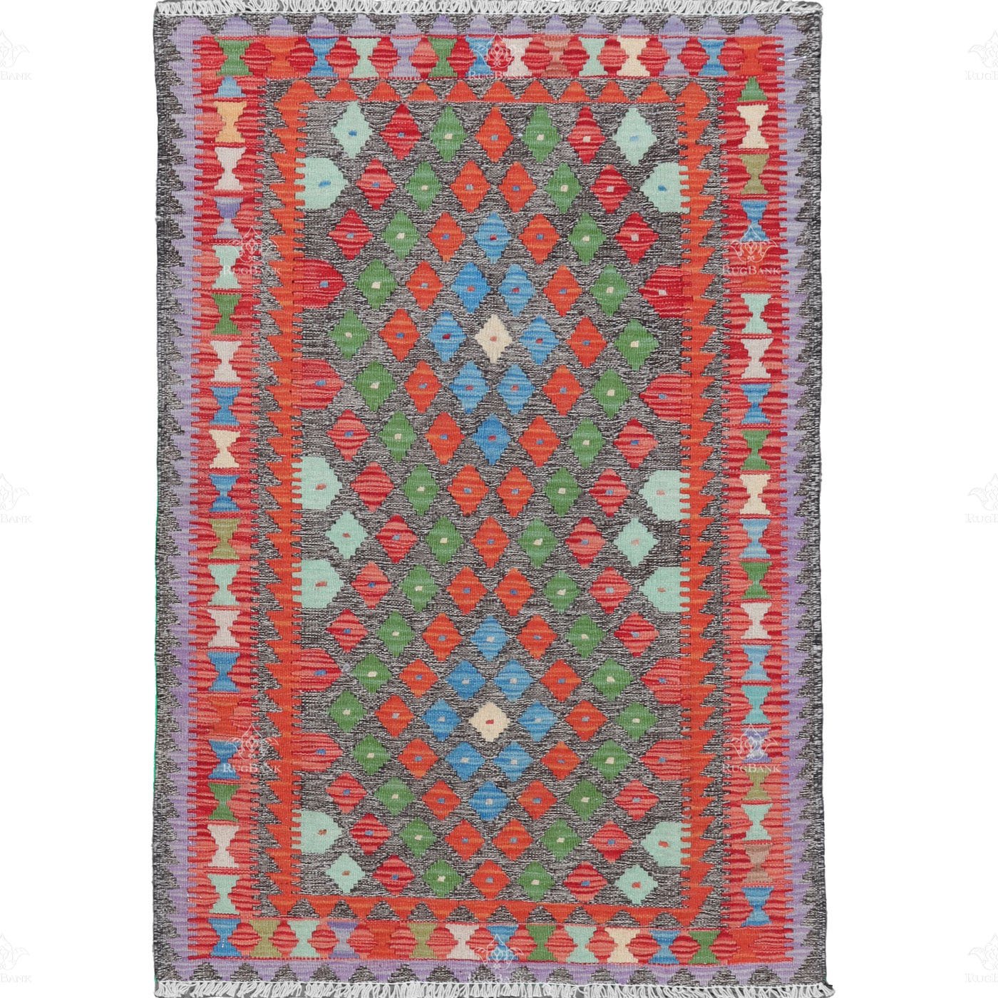 At the heart of this kilim’s design, you’ll discover two large diamond shapes, both brimming with intricate details. These central diamonds are crafted from a mosaic of smaller diamond shapes, which collectively resemble the rich tapestry of life found in the natural world. The dynamic interplay of colors, predominantly red with accents of green and blue, conjures images of landscapes, flora, and the boundless sky.