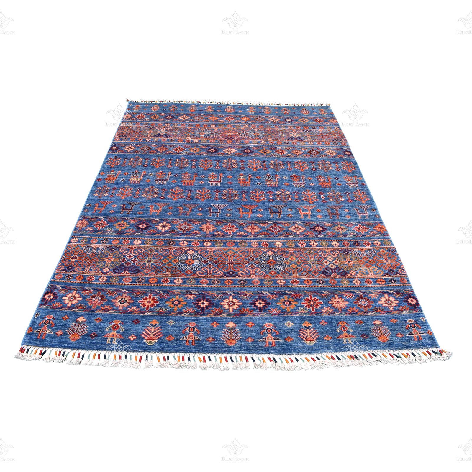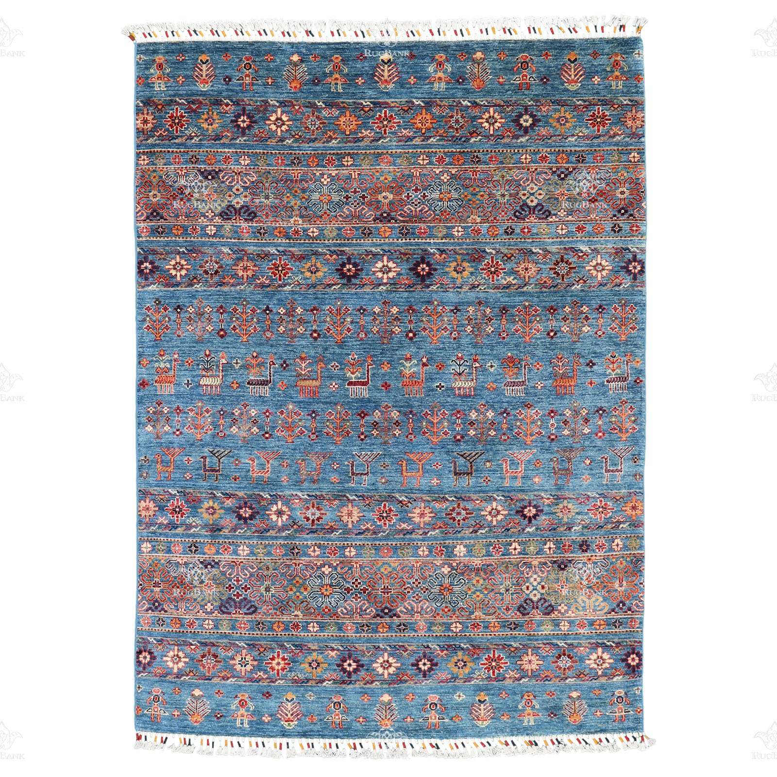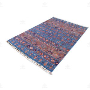 This is a Pakistani Khorjin rug with blue base color and transitional look, handmade woven with high-quality wool