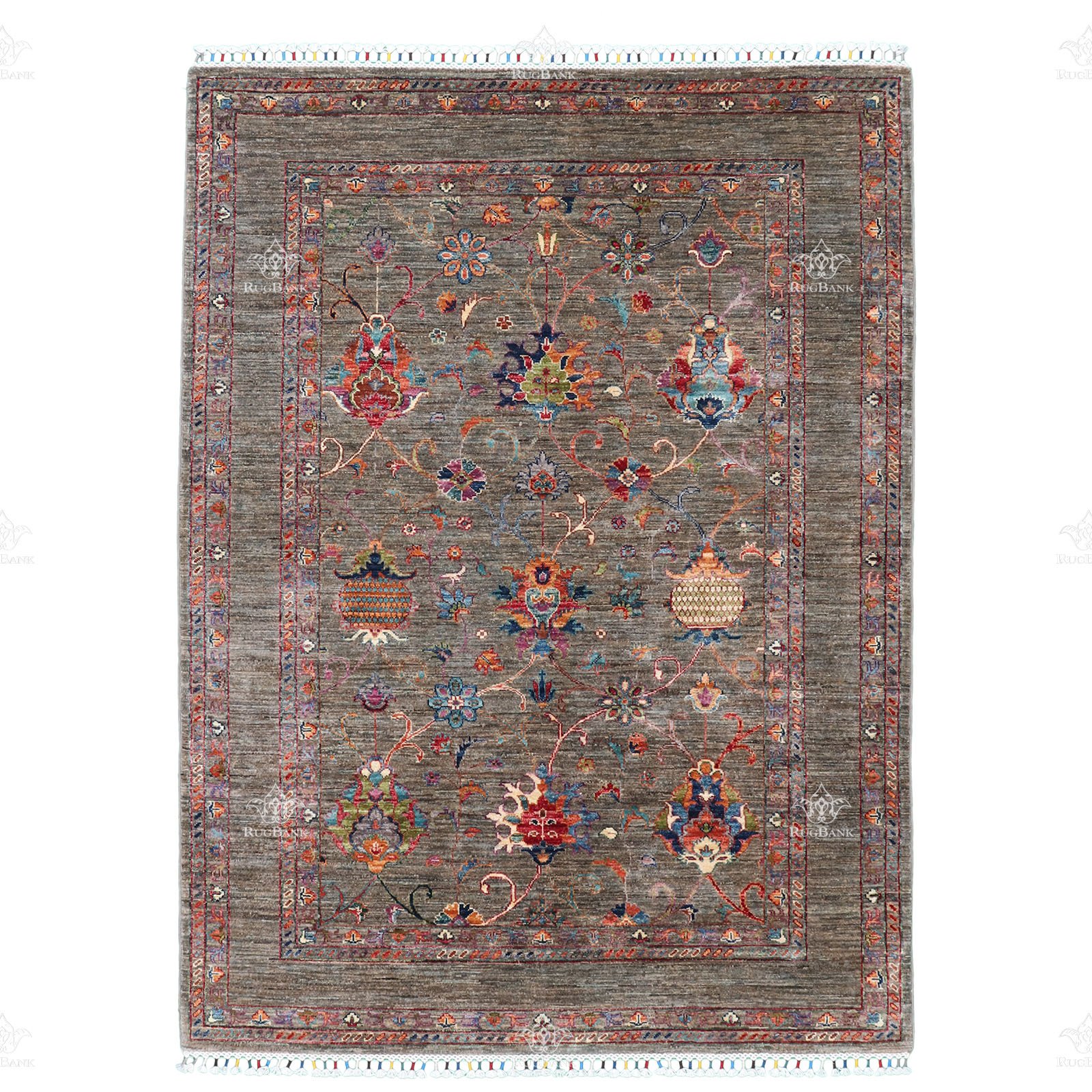 The background color of this rug is undyed dark wool. It’s natural with punches of bright colors.