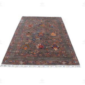 Interesting Ariana rug with undyed dark wool background and colorful motifs