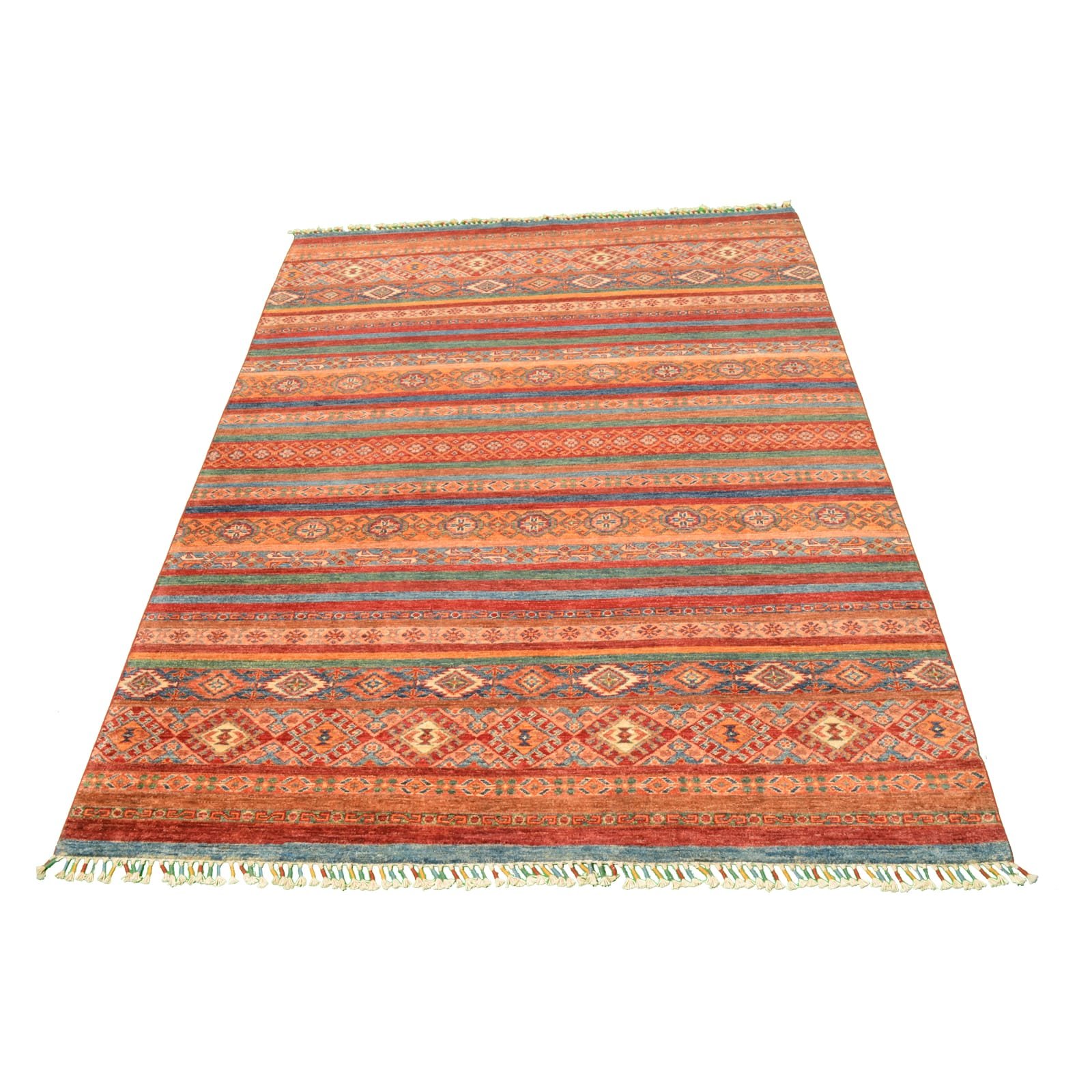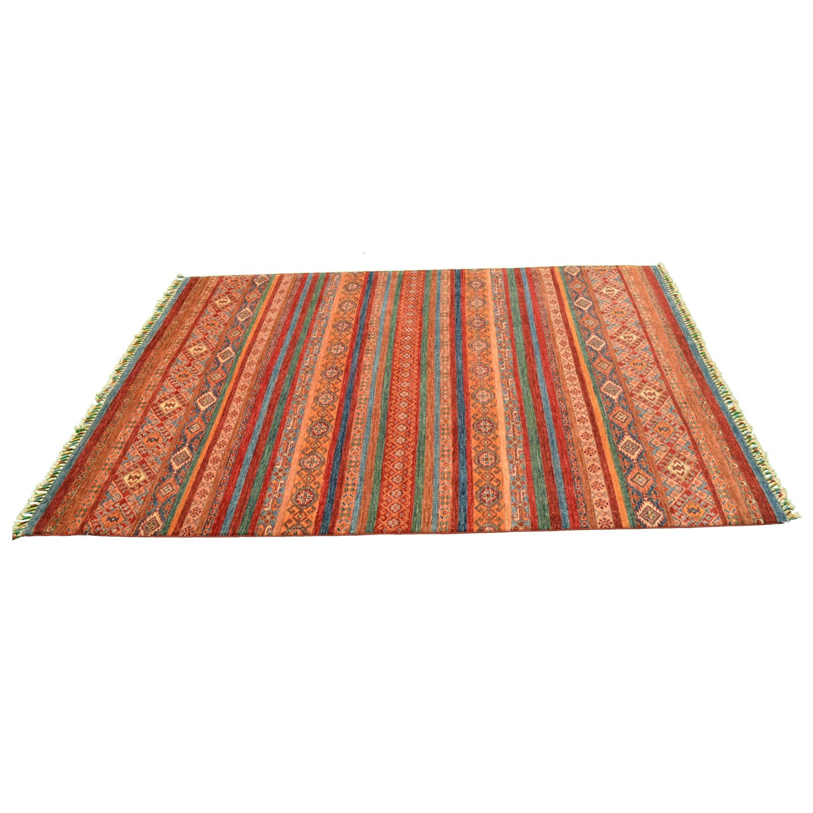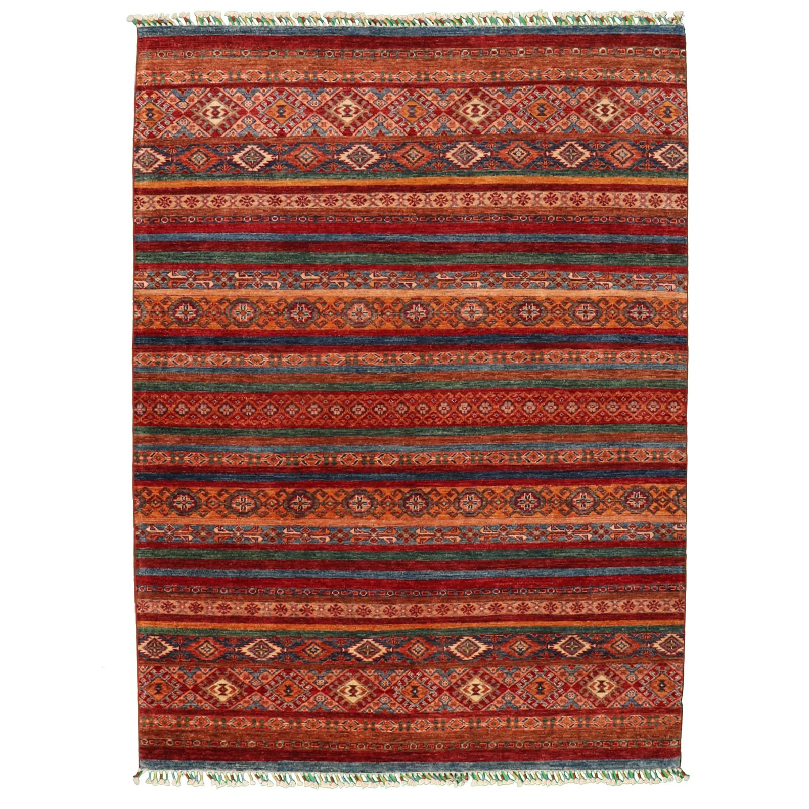 Admire the linear pattern that graces the rug, creating a sense of movement and visual interest. The rich, warm tones and intricate details contribute to a lively and inviting atmosphere. Handmade with meticulous care, this rug exhibits a level of craftsmanship that ensures both durability and quality.