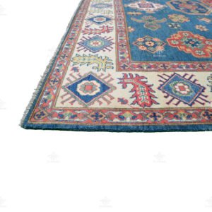 Introducing our captivating Kazak rug, a masterpiece of artistry and craftsmanship, proudly crafted in Pakistan. With its bold geometric design and a serene blue base, this rug is a visual enigma that will transform your living space.