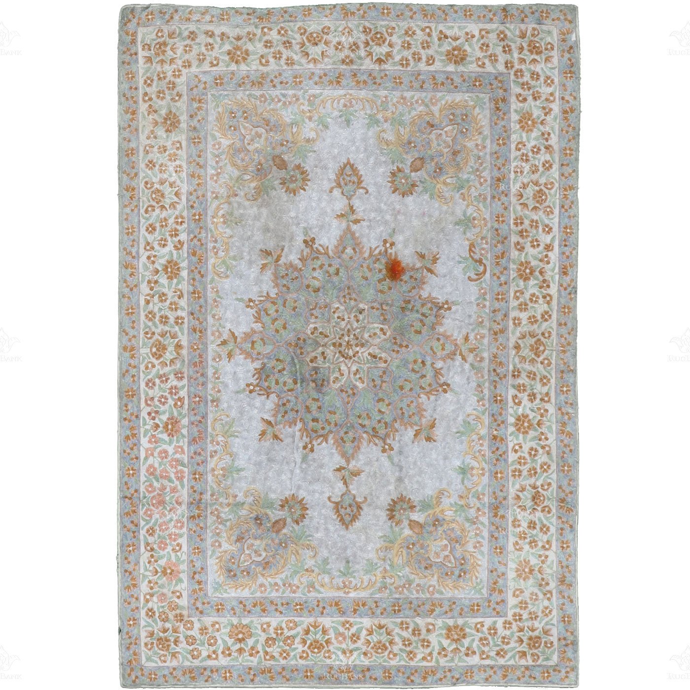 What makes this rug even more unique is the subtle and strategic use of a special light green color. This green is sparingly introduced to the design, creating a sense of harmony and balance within the rug. It provides a delightful contrast to the silver gray and yellow gold, making the overall composition even more captivating.